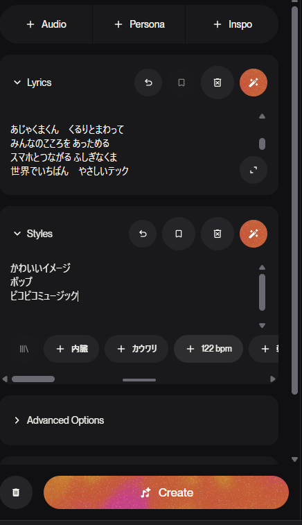 歌詞をいれて、作ってほしい音楽のジャンルやテイストを入力すると